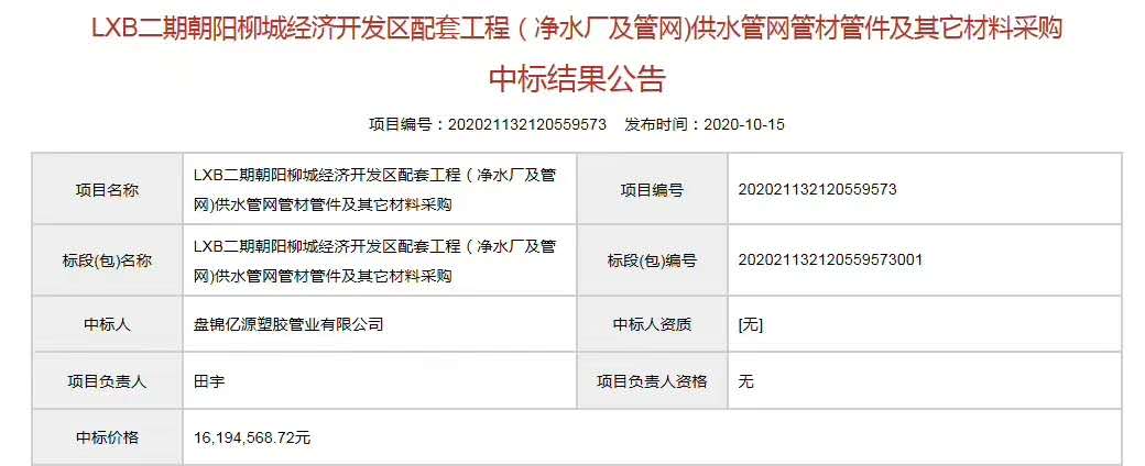 【慶祝盤錦億源塑膠管業有限公司喜中LXB朝陽柳城經濟開發區凈水廠供水管網項目】