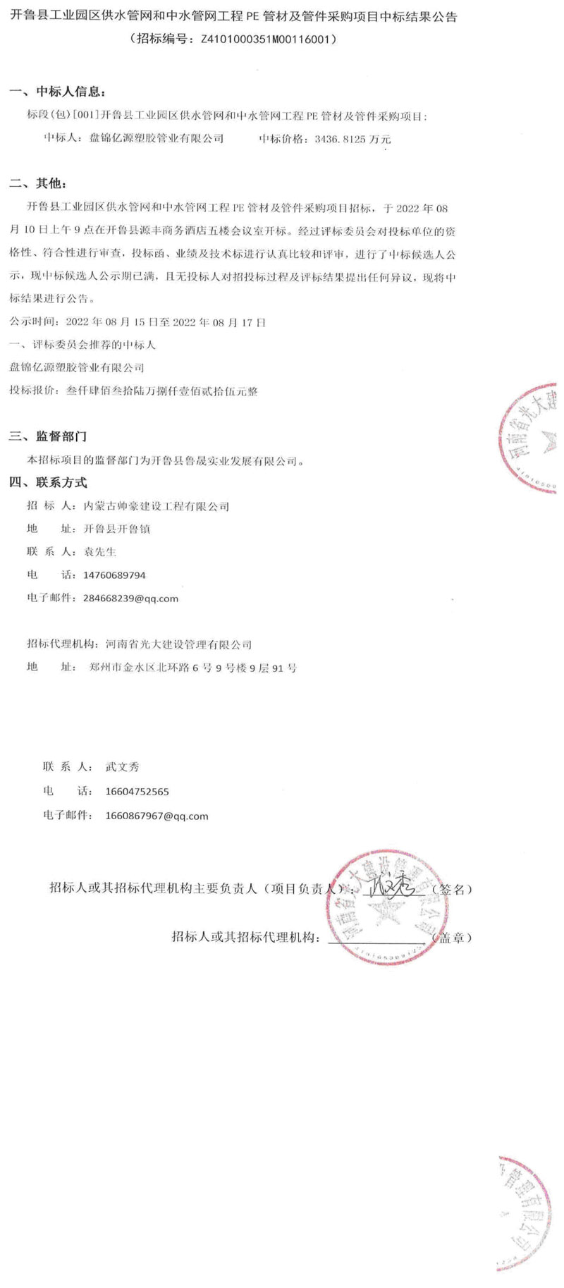 2022年8月10日,盤錦億源塑膠管業有限公司憑借綜合實力成功中標開魯縣工業園區供水管網和中水管網項目工程,中標金額:3436.8125萬元。