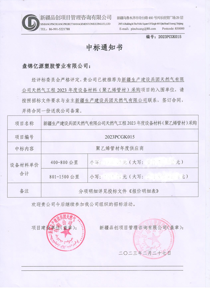 熱烈慶祝億源管業(yè)成功中標(biāo) 《新疆生產(chǎn)建設(shè)兵團(tuán)天然氣有限公司天然氣工程2023年度設(shè)備材料(聚乙烯管材)采購項(xiàng)目》 2023年2月27日,盤錦億源塑膠管業(yè)有限公司憑借綜合實(shí)力成功中標(biāo)新疆生產(chǎn)建設(shè)兵團(tuán)天然氣有限公司天然氣工程2023年度設(shè)備材料(聚乙烯管材)采購項(xiàng)目。 億源管業(yè),追求卓越品質(zhì),致力于打造市政管道優(yōu)質(zhì)品牌